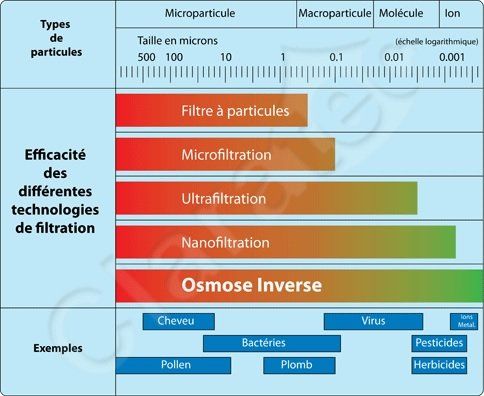 L'osmose inverse est un système de filtration très fin, qui ne laisse passer que les molécules d'eau. Le procédé retient notamment le chlore, les nitrates, les pesticides, les résidus médicamenteux... en somme, tout ce qui n'est pas de l'eau !